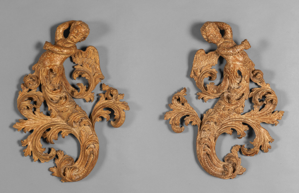 Coppia di fregi Luigi XIV in legno intagliato e laccato a volute con putto sec.XVIII
