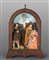 Presepe con figure in terracotta e vestiti in stoffa dentro teca in legno sec.XX