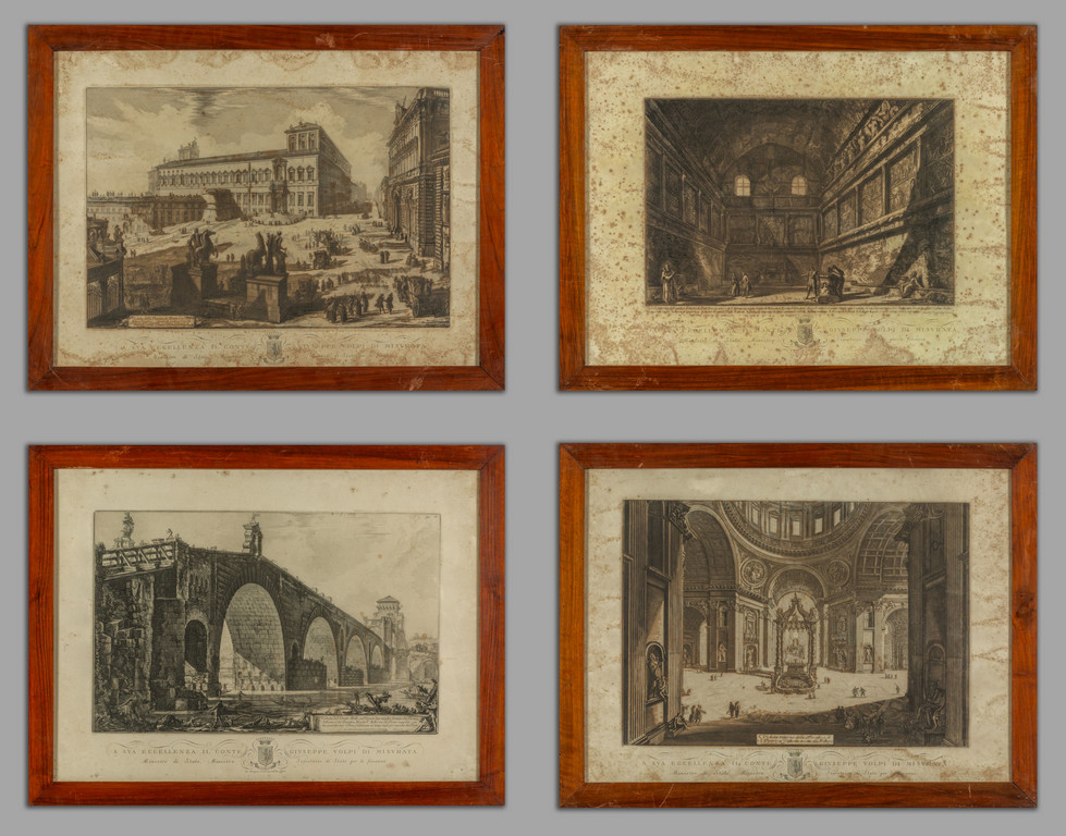 'Veduta interna dell'antico tempio di Bacco' 'Veduta del ponte Molle sul Tevere' ' Veduta di Piazza Monte Cavallo' e 'Veduta della Basilica di San Pietro' 4 stampe da Piranesi eseguite dalla Regia Calegrafia ed offerta a sua Eccellenza il Conte Giuseppe Volpi di Misurata I metà sec.XX