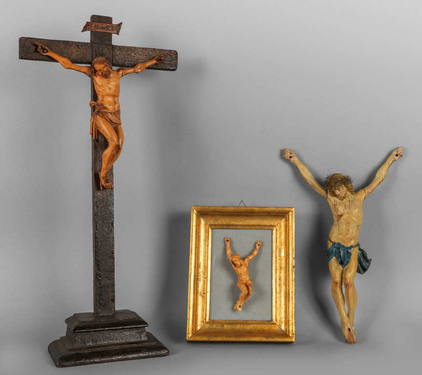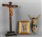 Tre sculture raffiguranti una un Cristo in legno di bosso una un Cristo in legno intagliato e laccato entrambi del sec.XVIII ed una più piccola raffigurante un Cristo in una cornice in legno dorato