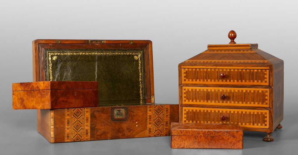 Quattro scatole di forme diverse di cui una con scrittoio da viaggio