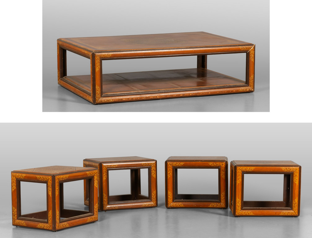 Tavolo da sofà in legno (cm.92x143xh.40) e quattro piccoli tavolini (cm.53x43xh.40)