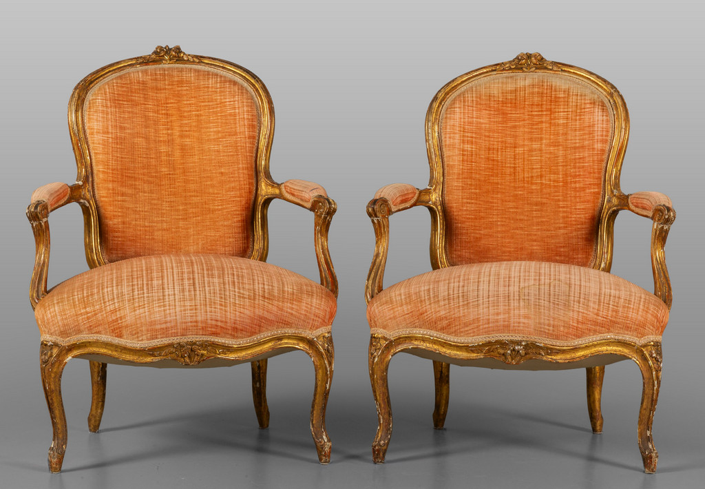 Coppia di grandi poltrone Napoleone III in legno intagliato e dorato Francia sec.XIX
