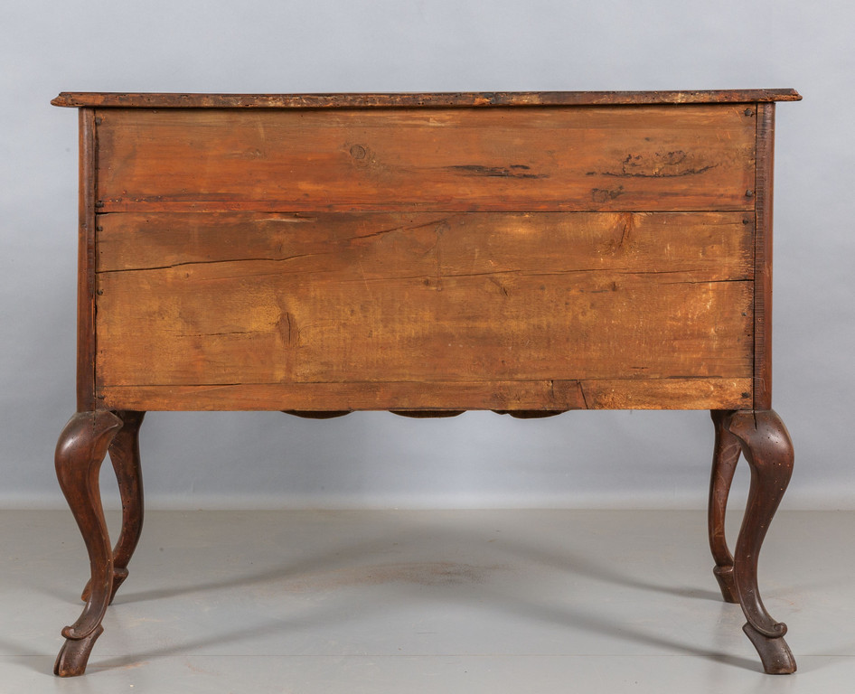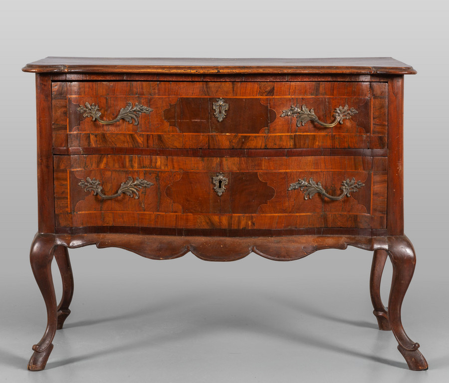 Comò Luigi XIV a due cassetti mosso sul fronte gambe alte a zoccolo di capra Alto Veneto sec.XVIII