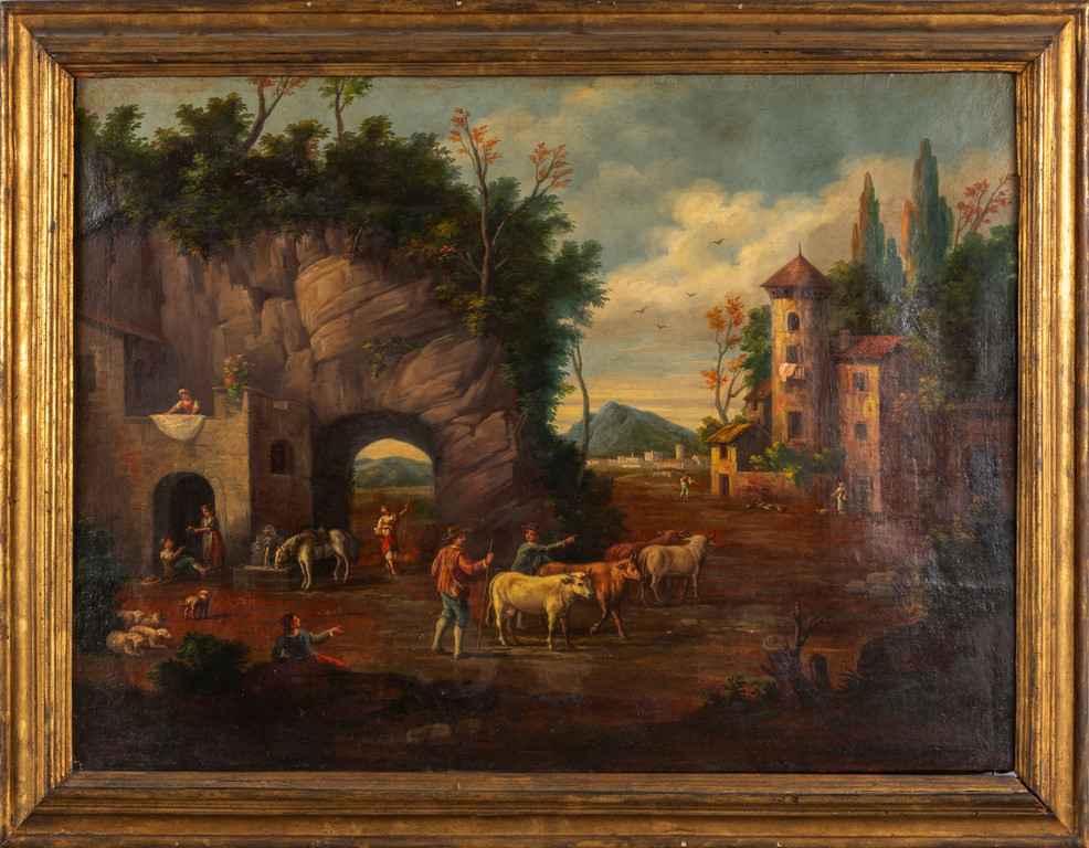 Precedente Lotto 0588 Successivo Aste Boetto - Via Mura dello Zerbino 10R, 16122 Genova ASTA DI ANTIQUARIATO E ARTE ORIENTALE ASTA DI ANTIQUARIATO E ARTE ORIENTALE mercoledì 11 dicembre 2024 ore 10:00 (UTC +01:00) DIPINTO 'Paesaggio con figure ed armenti' olio sec.XXcm. 132x97