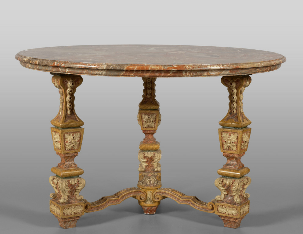 Tavolo da centro in legno laccato di forma rotonda in stile antico piano in marmo
