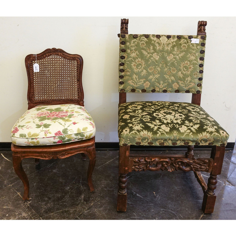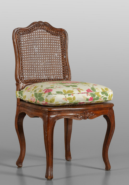 Sedia Luigi XV in noce schienale e sedile a cannè Genova sec.XVIII e sedia a rocchetto in noce sec.XVII