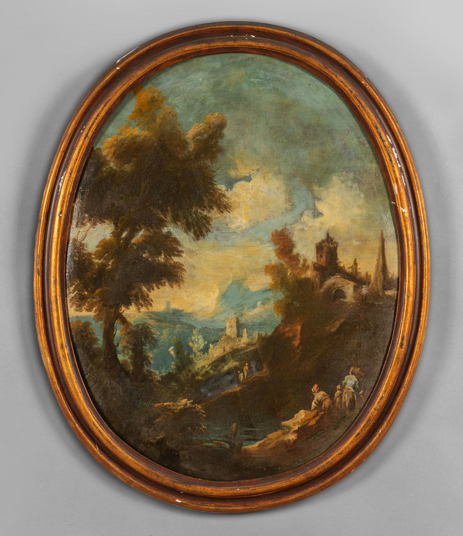 'Paesaggio con figure' olio di forma ovale sec.XVIII