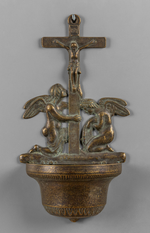 Grande acquasantiera in bronzo brunito raffigurante un Crocefisso con due angeli adoranti sec.XIX