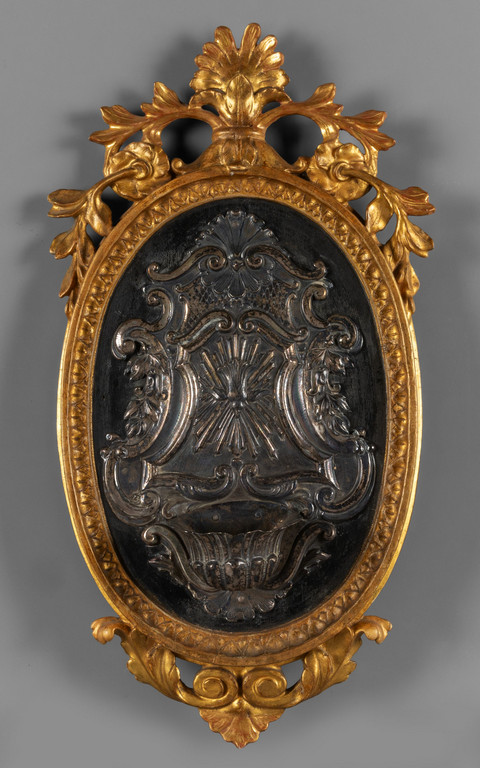 Acquasantiera in argento con cornice in legno intagliato e dorato punzone di Giovanni Felice Sanini e punzone di Roma periodo 1747-1787