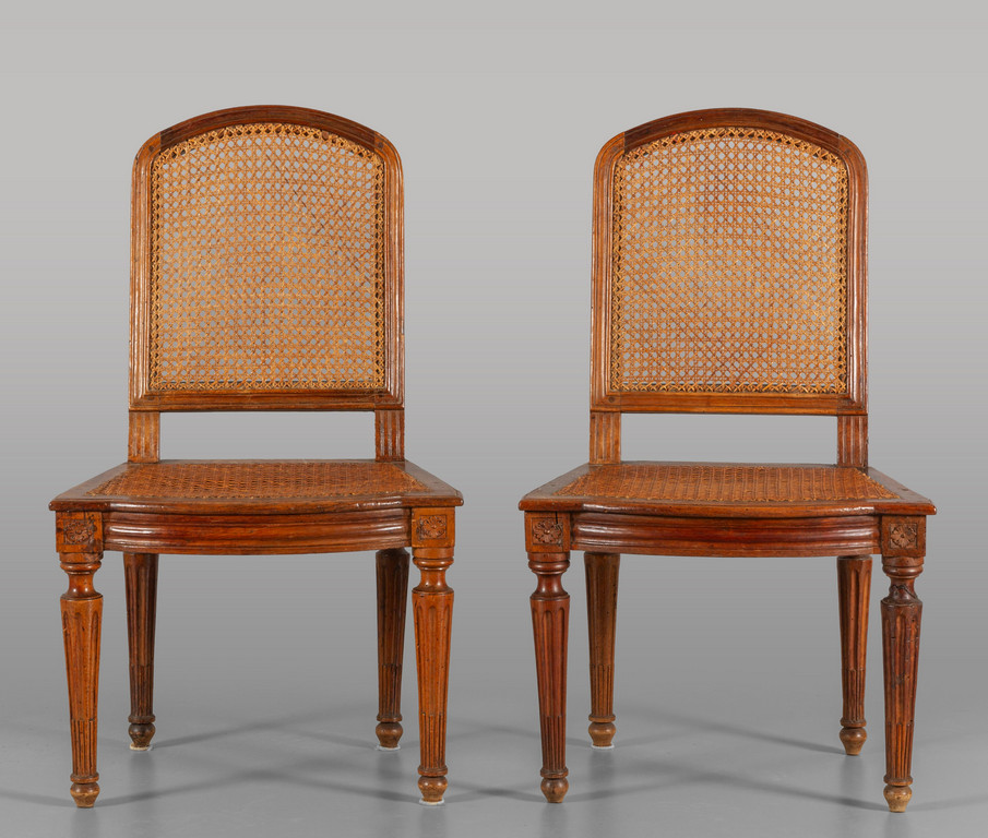 Coppia di sedie Luigi XVI in noce schienale ad arco gambe scanalate e controscanalate Genova II metà sec.XVIII