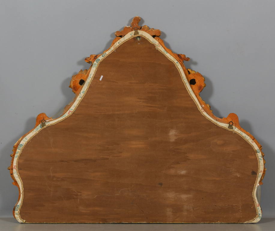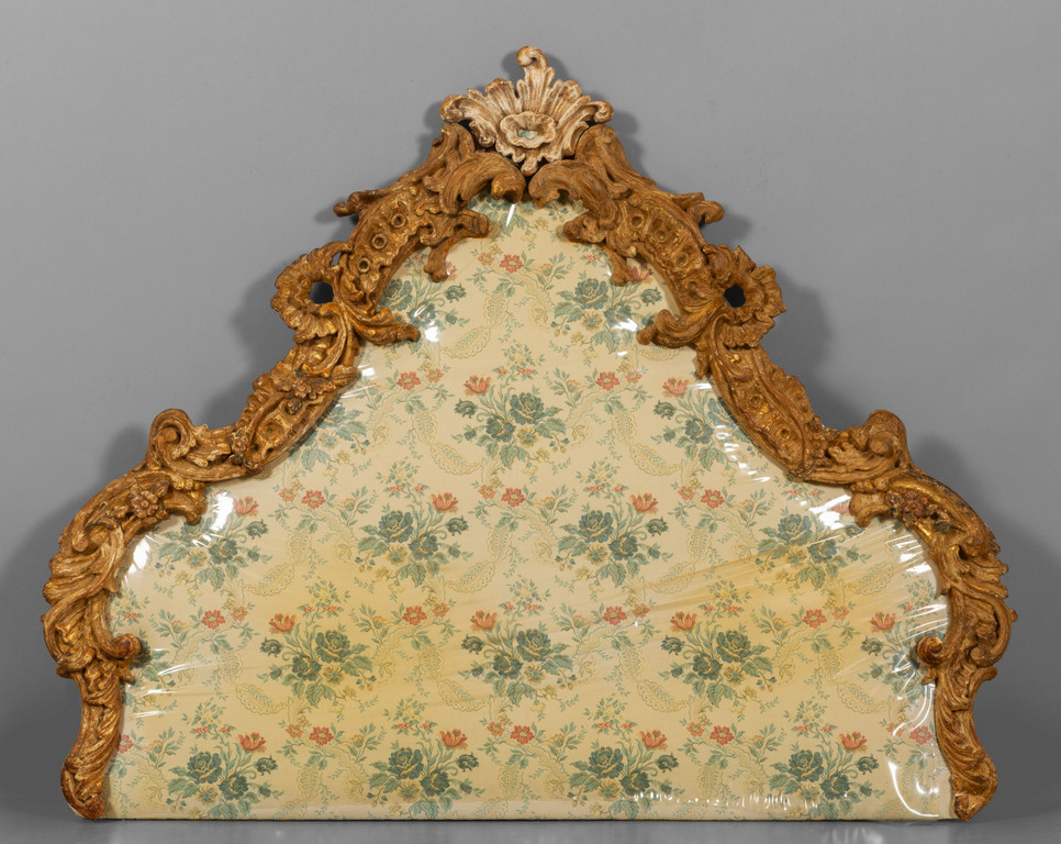 Testata da letto in legno intagliato dorato e laccato composta con elementi antichi