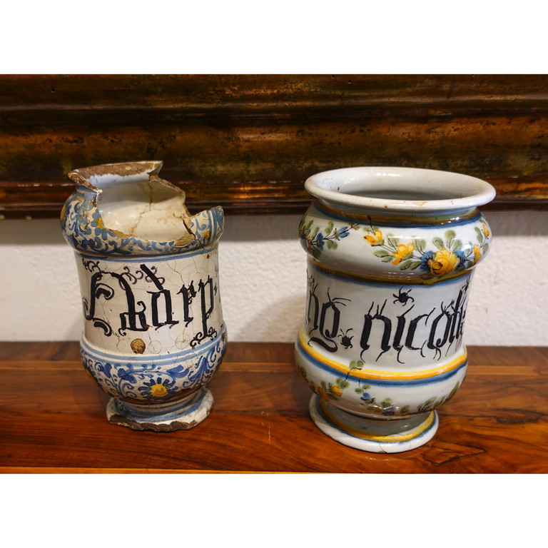 Due albarelli in ceramica di cui uno con gravi difetti sec.XVIII