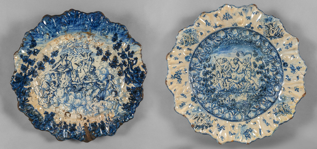 Due piatti modello argenteria in maiolica bianca e blu con decoro di scene barocche marca Stemma Savona sec.XX