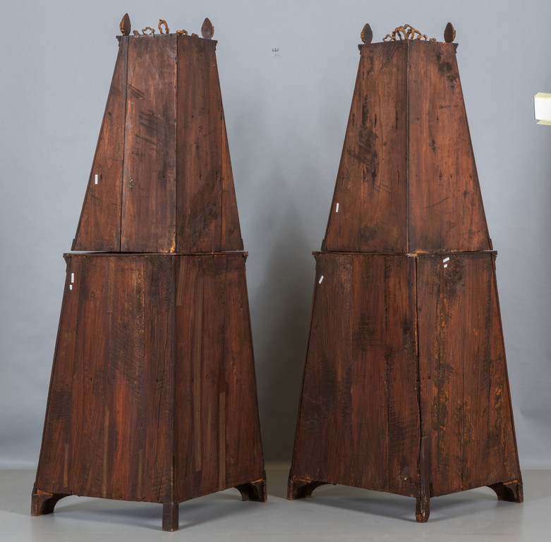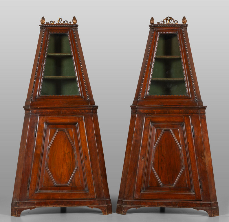 Coppia di cantonali in noce a due corpi piano inferiore con grande sportello scolpito parte superiore a vetrina con cimasa in legno intagliato e dorato (mancanze)