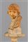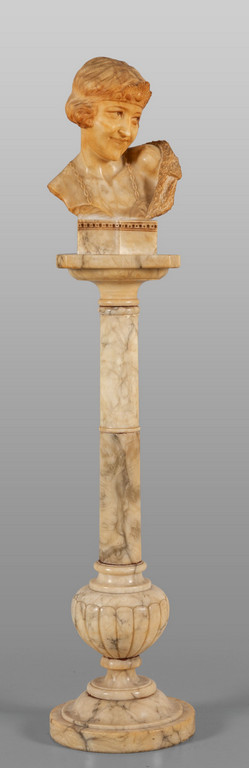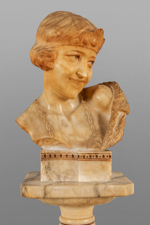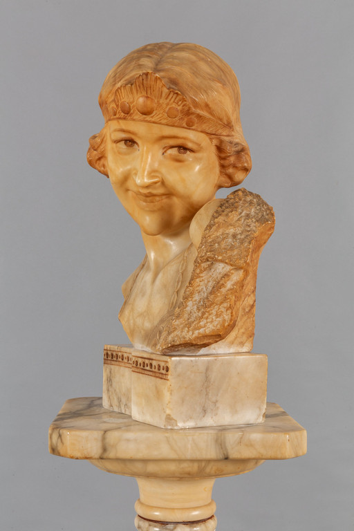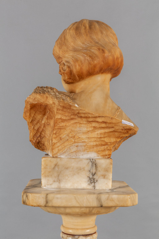 Busto di fanciulla Liberty in alabastro scolpito poggiante su colonna coeva