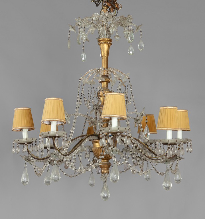 Lampadario Luigi XVI a otto luci in legno intagliato e dorato con ricca decorazione in cristalli Genova fine sec.XVIII