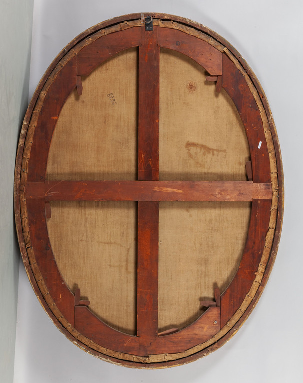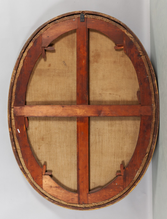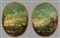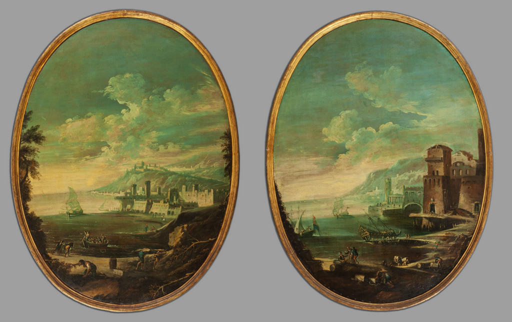 Scuola genovese inizi sec.XVIII 'Paesaggi marini con velieri e personaggi' coppia di olii di forma ovale