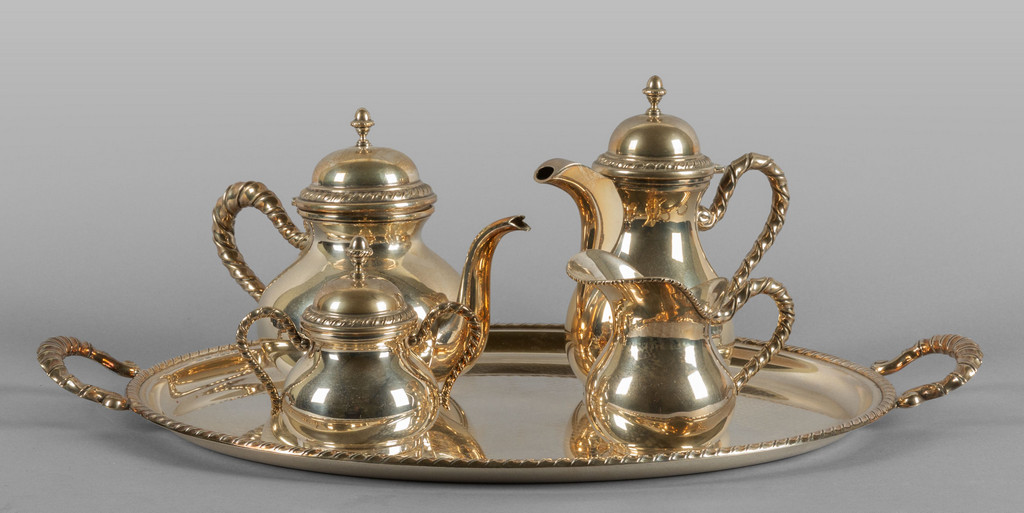 Servizio da thè in argento composto da quattro pezzi ed un vassoio bordo decorato a torchon