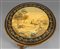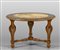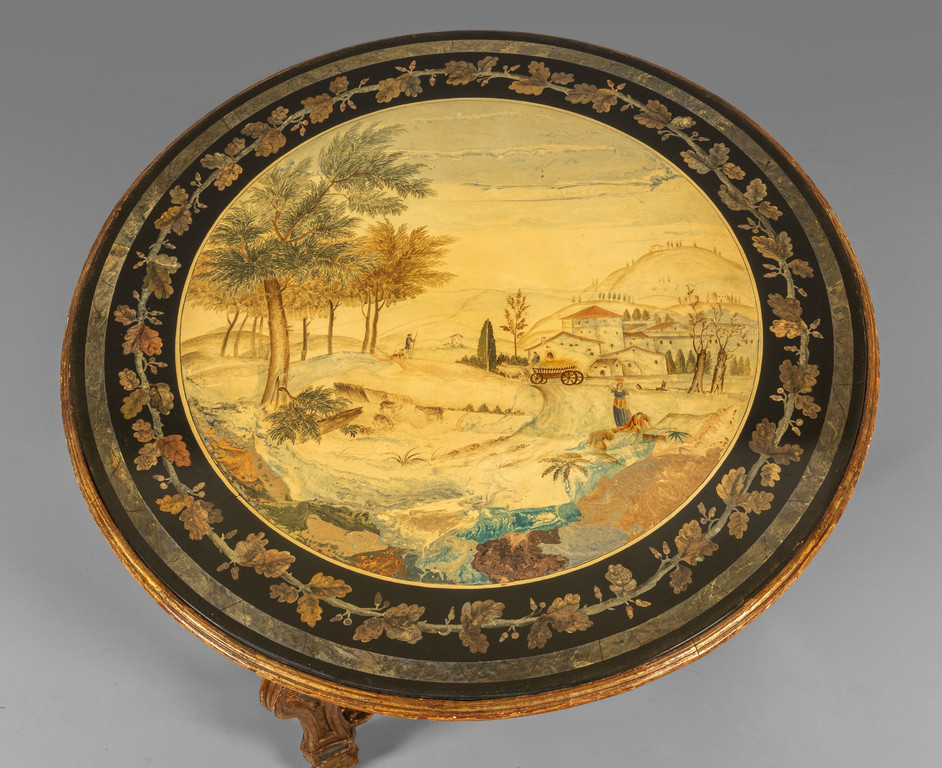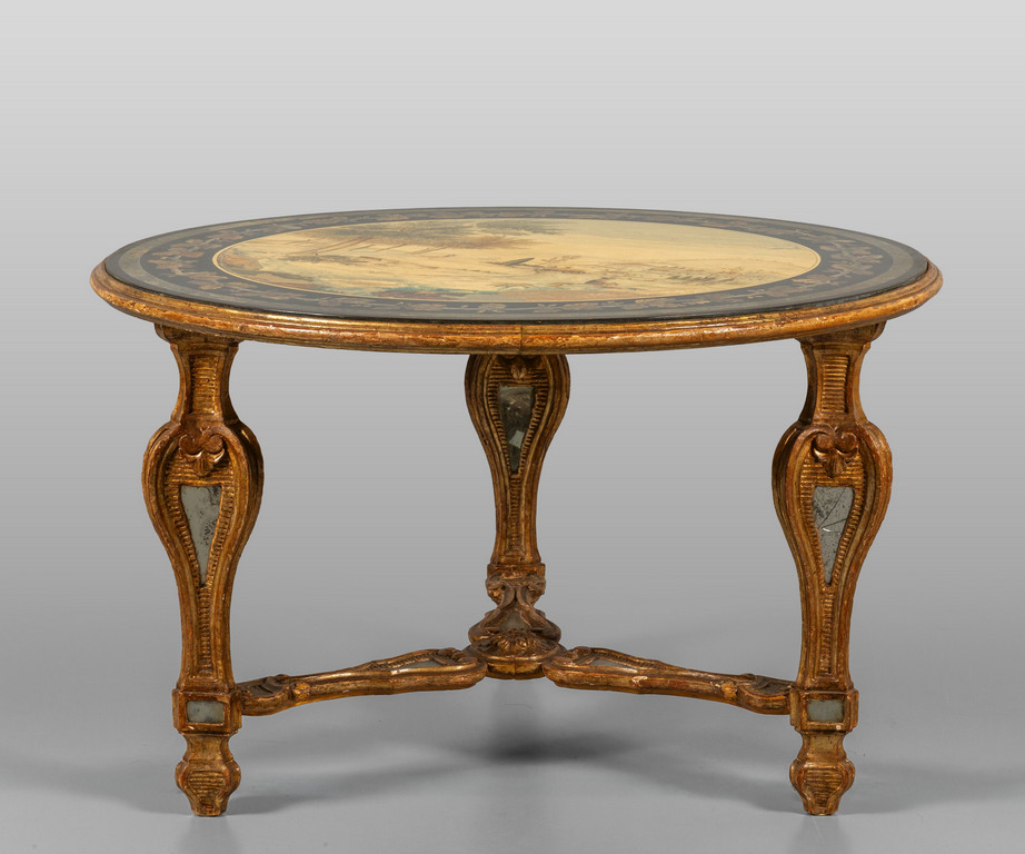 Tavolo rotondo con piano in scagliola decorato a paesaggio gambe riunite da traversa in legno dorato con applicazioni di specchi I metà sec.XX