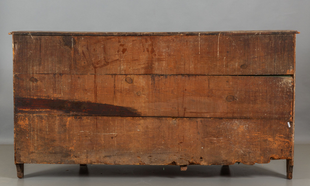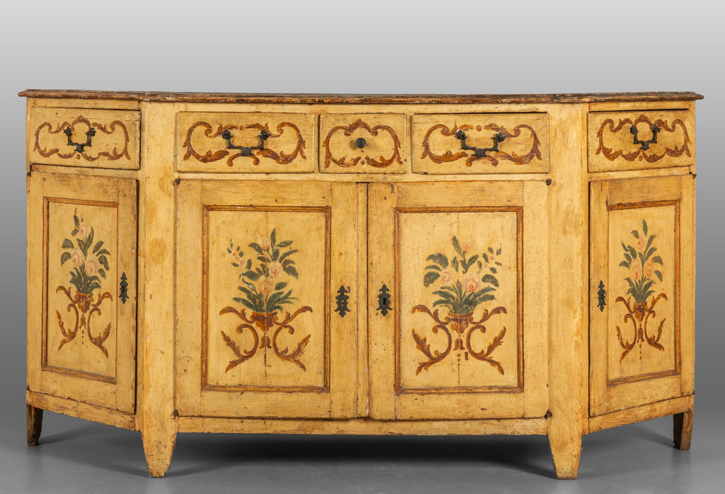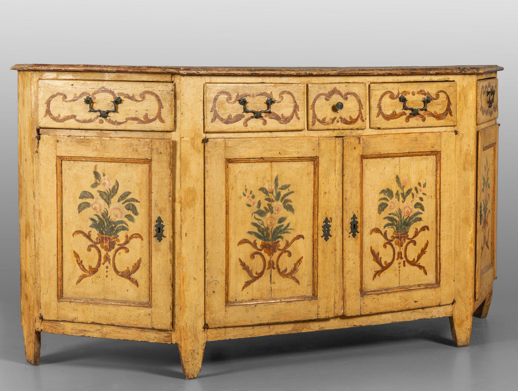 Credenza scantonata in legno laccato a fiori su fondo crema quattro cassetti e quattro sportelli sec.XVIII