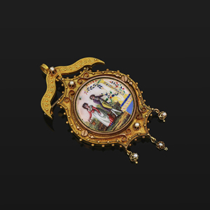 Spilla in oro giallo di epoca '800 al centro grande miniatura su ceramica raffigurante due giovani.