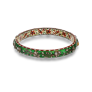 Bracciale bangle rigido indiano in oro giallo completamente ricoperto di smalti policromi a rappresentare ramage e foglie impreziosito da diamanti rose cut.