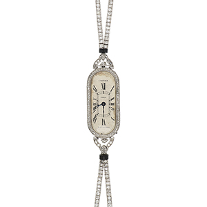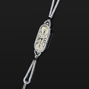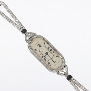 CARTIER - Orologio per signora di forma ovale allungata realizzato in platino la fine manifattura è contraddistinta da lunetta arricchita con diamanti taglio rosa e bracciale snodato con barilotti di onice alle strette anse.