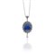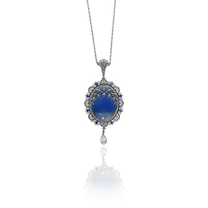 Orologio gioiello straordinaria lavorazione anni '20 in platino un diamante a goccia taglio antico di ct. 1 00 ca pende da un ovale con smalti azzurri a guilloche' finemente decorati a soleil e sormontati da un traforo a pizzo sul fronte nascondono al retro l' orologio.