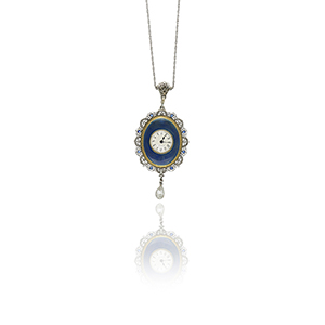 Animato da movimento meccanico a carica manuale con quadrante a numeri arabi e sfere azzurrate a freccia è circondato da smalti azzurri e un cordoncino in oro giallo.