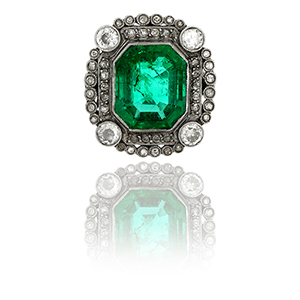 Anello in platino anni '20 con smeraldo centrale di forma ottagonale taglio a gradini di 4 39 ct accompagnato da certificato gemmologico svizzero SSEF che ne attesta l'origine colombiana e moderato trattamento con olio. La montatura è impreziosita da stimati 0 70 ct di diamanti di taglio antico incassati a milligrana.