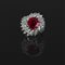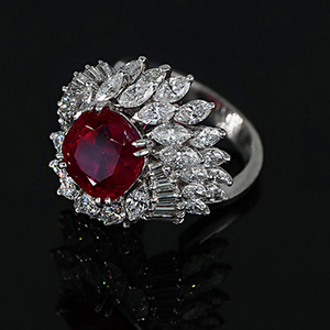 Anello in platino con importante rubino centrale di forma a cuscino di ct 6 03 accompagnato da certificato gemmologico svizzero SSEF attestante l'origine birmana e l'assenza di trattamento termico. L'anello presenta un doppio contorno a raggiera di diamanti di forma a marquise taglio a brillante e Baguette per stimati 5 00 complessivi.
