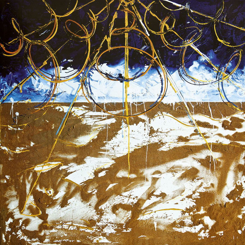 MARIO SCHIFANO Homs 1934 – Roma / Rom 1998 ATTRAVERSO IL DESERTO SENZA NOME 2, 1984 Tecnica mista e sabbia su tela, cornice dipinta, 280 x 280 cm Provenienza: direttamente dallo studio dell’artista; già Ruggerini e Zonca; collezione privata Milano Esposizioni: Zonca & Zonca Arte Moderna e Contemporanea, Milano 2006 Bibliografia: Mario Schifano Deserts, cat. della mostra, Museo Archeologico di Capocolonna, Crotone, 3 dicembre 2005 – 31 gennaio 2006, illustrato; Mario Schifano, Italians and the East – B enchmarks 1860 – 1984, a cura di F. D . Castro, Le Parole Gelate, Roma 1985, illustrato; “L’arte avventurosa di un pittore di confine”, p. 13 – 23, in Schifano 1934 – 1998, a cura di Achille Bonito Oliva, illustrato, Milano 2008