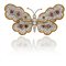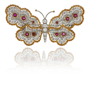 Spilla a forma di farfalla in oro bianco e giallo il corpo formato da 6 diamanti taglio brillante per ct. 0 60 ca. le ali con 10 rubini taglio tondo per complessivi ct. 1 00 ca. la lavorazione ricorda quella di 'Buccellati'.