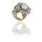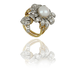 Anello in platino e oro giallo particolare lavorazione a forma di bocciolo fiorito al centro perla giapponese coltivata di 10 00 mm sui petali piccoli diamanti taglio antico e 16/16.
