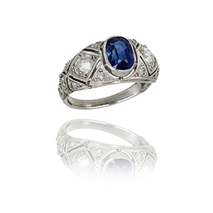 Anello in oro bianco di antica manifattura al centro zaffiro naturale taglio ovale di circa ct. 1 30 affiancato da due diamanti naturali taglio antico altri sul gambo ad arricchire il decoro traforato.