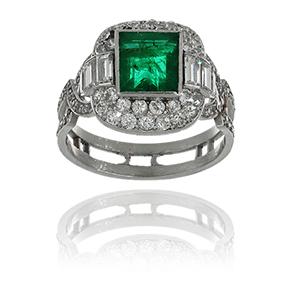 Anello decò in platino di ottima fattura con smeraldo rettangolare centrale di circa 1 20 ct diamanti di forma rotonda e baguette completano il decoro.