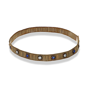 Doppio bracciale in oro giallo componibile in collana lavorazione a maglia 'Milano' decorata con 5 luminosi zaffiri blu per complessivi ct. 3 90 ca e 4 diamanti taglio antico per complessivi ct. 1 20 ca.