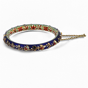 Antico bracciale indiano a bangle rigido con snodo a cerniera in oro giallo ricoperto interamente di smalti policromi impreziosi da diamanti taglio a rosa e rubini (alcune pietre mancanti) motivi a ramage e floreali.
