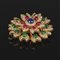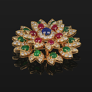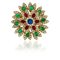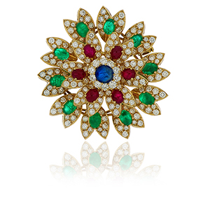 Grande spilla da cappotto in oro giallo a rosone tempestata da 10 smeraldi ovali cabochon per stimati 7 ct 6 rubini ovali cabochon per stimati 4 2 ct uno zaffiro tondo cabochon di stimati 2 20 ct e contornata da diamanti di forma rotonda taglio a brillante per totali stimati 7 40 ct.