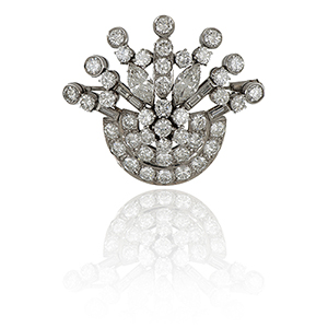 Spilla in platìno a raggiera anni '50 con due diamanti di forma a marquise di stimati 1 ct cad. e 43 diamanti di forma rotonda taglio a brillante e baguette per un totale stimato di 8 ct circa.