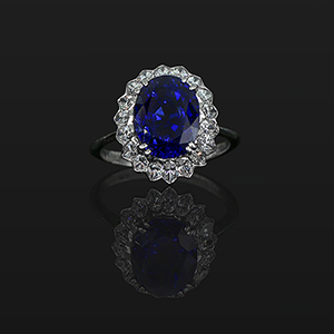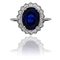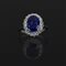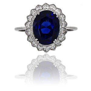 Fine anello in platino anni '30 a contorno con zaffiro naturale di forma ovale di 6 60 ct accompagnato da certificato gemmologico attestante l'origine Ceylon e l'assenza di trattamento termico. A contorno 12 diamanti di forma a marquise per stimati 1 00 ct.