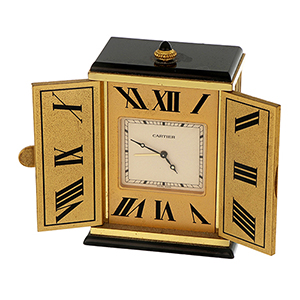 CARTIER - Orologio da comodino a casetta due ante nascondono il classico quadrante con numeri romani agli indici animato da movimento al quarzo con sveglia.
