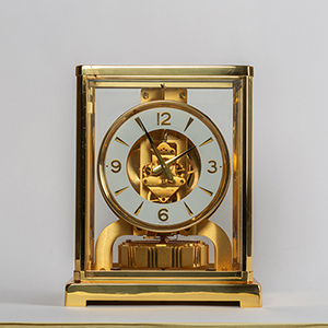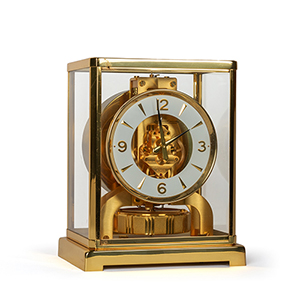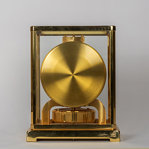 JAEGER LE COULTRE - Orologio da tavolo modello ATMOS struttura in ottone con vetri laterali quadrante bianco con movimento parzialmente a vista firmato Jaeger Le Coultre Atmos indici cuneiformi applicati movimento perpetuo a pressione atmosferica.x