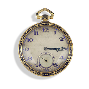 BAUME ET MERCIER - Orologio da tasca in oro giallo a singola cassa decori liberty in smalto nero sulla lunetta e al retro movimento meccanico a carica manuale quadrante bianco con lievi difetti numeri arabi agli indici azzurrati piccoli secondi a ore 6.