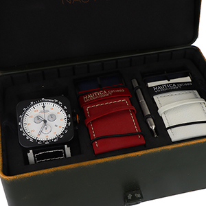 NAUTICA - Orologio da uomo di forma quadrata in acciaio e cinturino in pelle con fibbia originale animato da movimento al quarzo con funzione cronometrica corredato di doppio cinturino scatola e documenti.