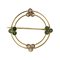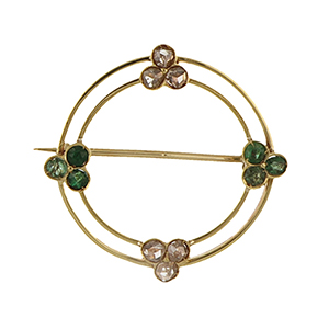 Piccola spilla rotonda in oro giallo piccoli smeraldi e diamanti taglio rosa ai punti cardinali.