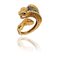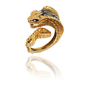Anello in oro giallo a forma di serpente cobra con smalti a decorare il corpo.