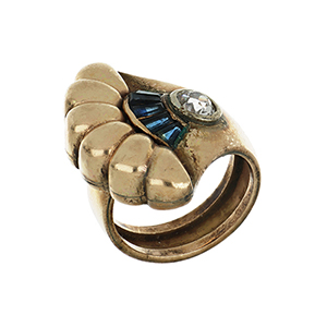 Anello anni 40 in oro rosso con diamante di taglio antico del peso stimato di ct. 0 50 e zaffiri taper posizionati a ventaglio.