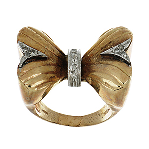 Anello anni 40 in oro rosso e inserti in platino a fiocco con piccoli diamanti taglio 8/8.